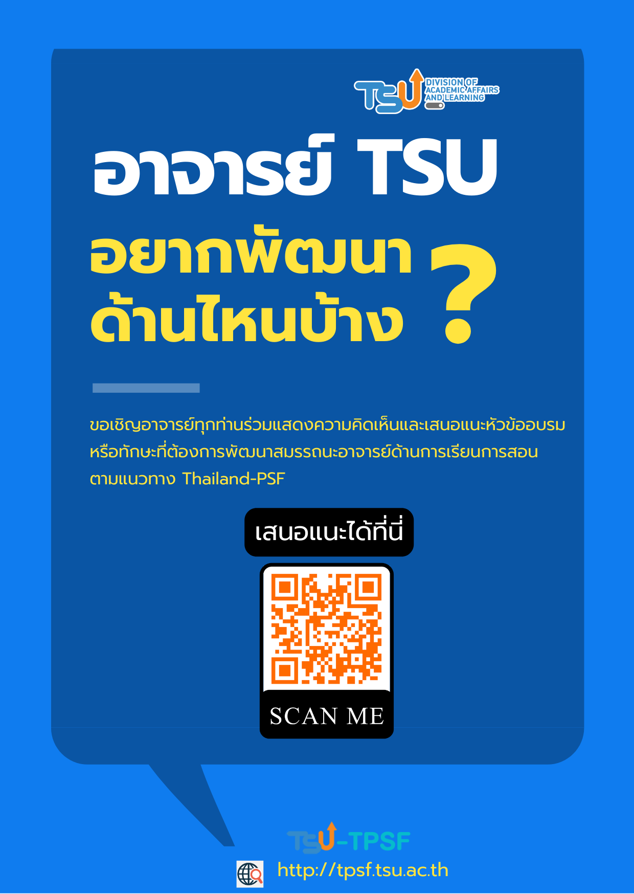 ฝ่ายวิชาการและการเรียนรู้  ขอเชิญอาจารย์ทุกท่าน ร่วมแสดงความคิดเห็นและเสนอแนะหัวข้ออบรมหรือทักษะที่ต้องการพัฒนาสมรรถนะอาจารย์ด้านการเรียนการสอนตามแนวทาง Thailand-PSF ในปีนี้